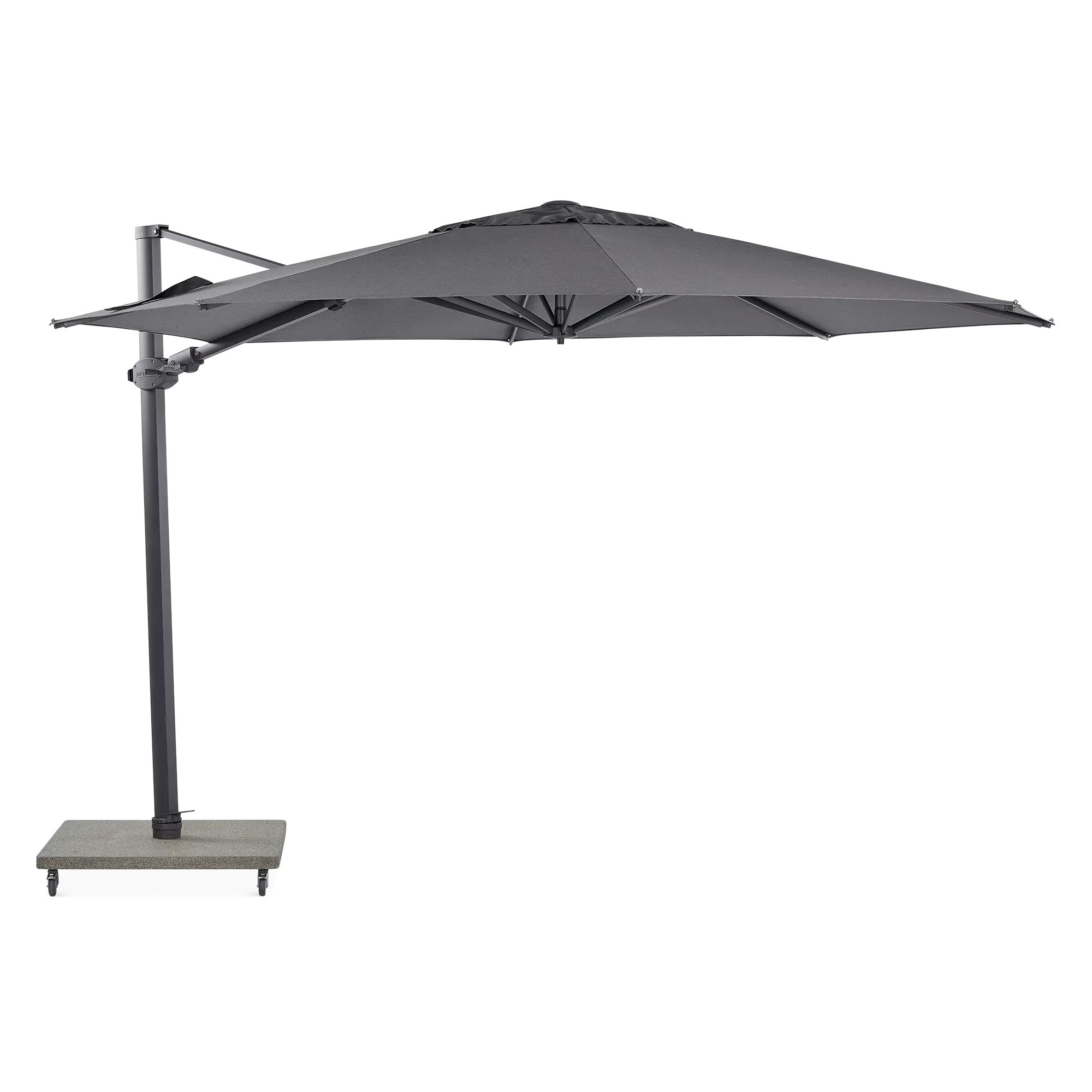 Antego is made for living large! Offering a shaded area that adapts to your space, this cantilever umbrella has an innovative operating system that offers various tilt positions. Its 125 kg base, mounted on wheels, allows for easy movement wherever you need it, whether on the patio or by the pool.